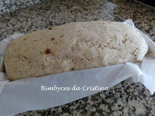 3. Numa superfície polvilhada com farinha, moldar o pão na forma desejada. Coloquei numa forma retangular e deixei levedar até dobrar de volume.