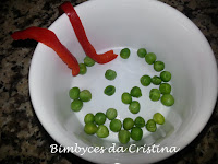 5. Num prato esmagar as batatas com um garfo e temperar com azeite. Colocar um aro num prato e deitar a esmagada de batata formando uma camada de cerca de 2cm de altura. Com o pimento vermelho, formar um coração e criar um fio com as ervilhas, de modo a que una este com a esmagada.
