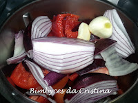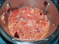 1. No copo da Bimby colocar o tomate cortado em quartos, o pimento em pedaços.
