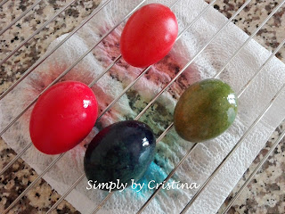 Misturar bem e colocar cada ovo na respetiva cor. Deixar repousar 10-15Min. para que possam tingir e adquirir a cor pretendida.