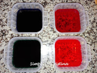 3. Em pequenos recipientes, colocar água até meio da sua capacidade. Adicionar 2c. sopa de vinho branco em cada e 1c. de café de corante alimentar.