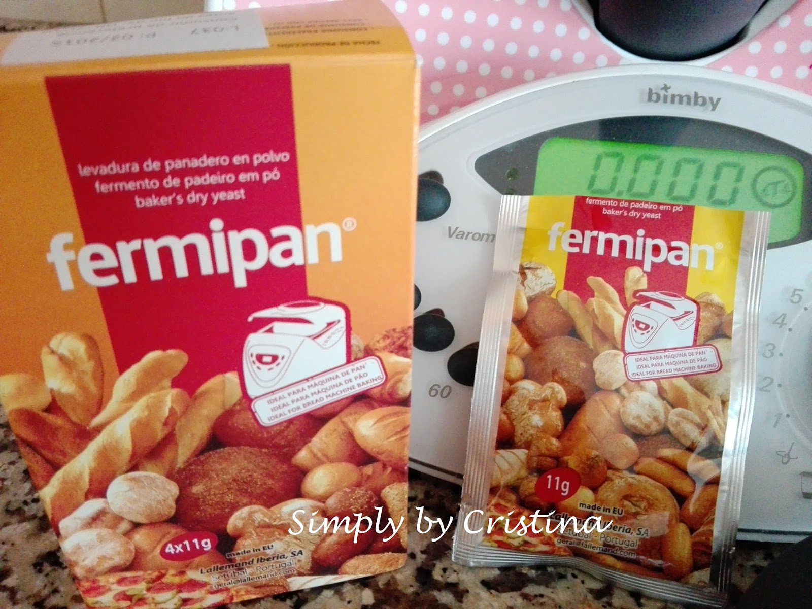 Ingredientes: 420g de farinha T55 6gr de fermento seco Fermipan 15g azeite 1c. café de Sal 240ml de soro do queijo OU água Preparação: 1. Colocar no copo da Bimby, o soro OU a água, o sal, o azeite e o fermento. Programar 2Min./37º/Vel.2 Adicionar a farinha. 2Min./Vel. Espiga