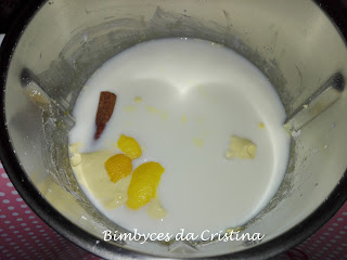 4. Adicionar o leite, as cascas de limão e o pau de canela. Programar 12Min./90º/Vel.2