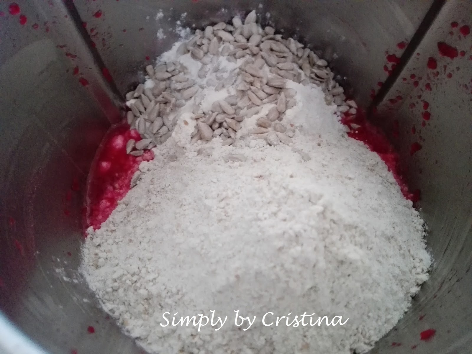 Ingredientes: 220g beterraba cozida (se a cozerem em casa, guardem a água da cozedura para o pão) 250g farinha de Arroz (pulverizei) 320g farinha Integral 300ml água (podem usar a da cozedura da beterraba) 11g Fermipan OU 25g fermento fresco de padeiro 20g azeite 1c. sopa de Vinagre branco ou de Sidra (vai ajudar a fixar a cor) 1c. chá de açúcar 1c. chá de Flor de Sal Salinas CORREDOR DO SOL 15g de sementes de Girassol OU outras a gosto Preparação: 1. No copo da Bimby colocar a água, o fermento, o sal, o açúcar. Programar 2Min./37º/Vel.2 2. Adicionar a beterraba cozida e triturar 7Seg./Vel.5