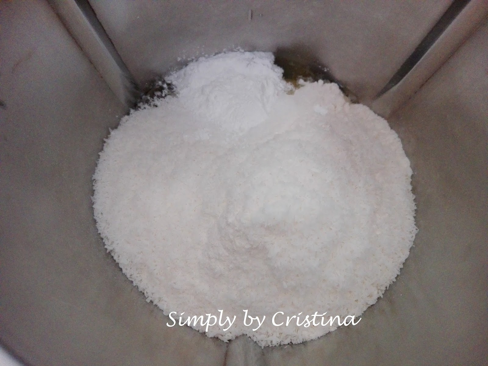 4 ovos 280g farinha T55 25g de coco ralado 40g açúcar 1c.chá de fermento para bolos