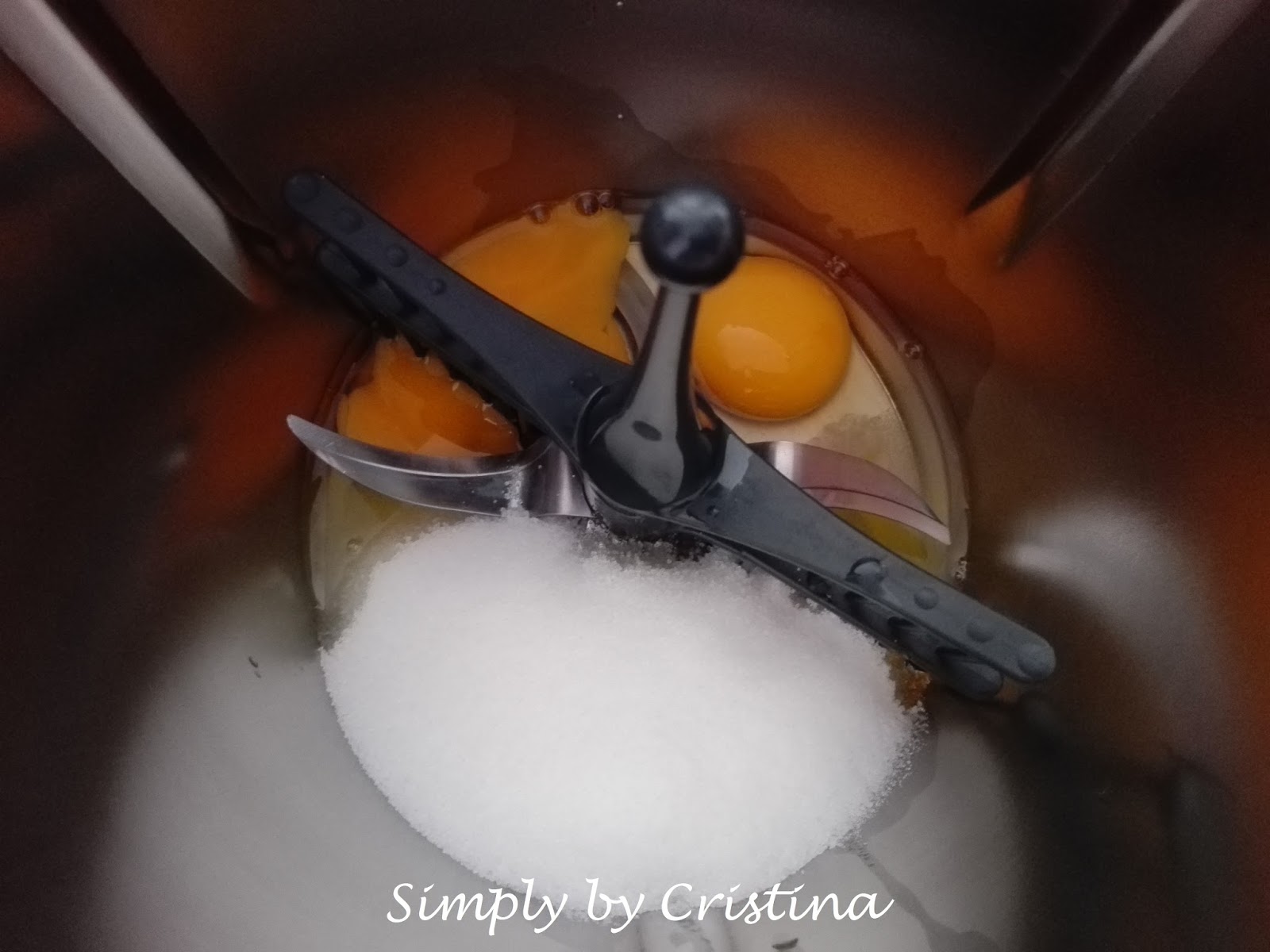 3. No copo limpo e seco, inserir a borboleta. 4. Separar as claras das gemas de 2 ovos. Reservar as claras. No copo deitar as 2 gemas e os 2 ovos inteiros. Adicionar o açúcar. Programar 6Min./Vel.3