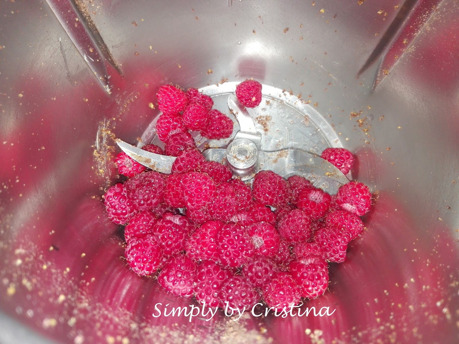 7. Adicionar o puré de framboesas e as folhas de gelatina hidratadas e derretidas no micro-ondas. Programar 2Min./50º/Vel.3