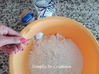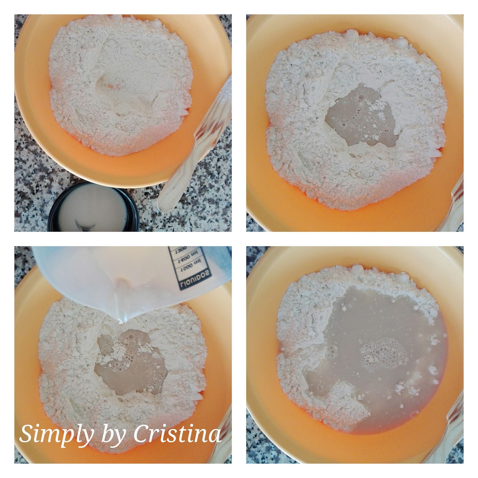 2. Deitar a farinha num recipiente e adicionar o sal. 3. Adicionar o fermento desfeito e depois juntar a restante água. Ir amassando até obter uma massa homogénea e formar uma bola.