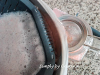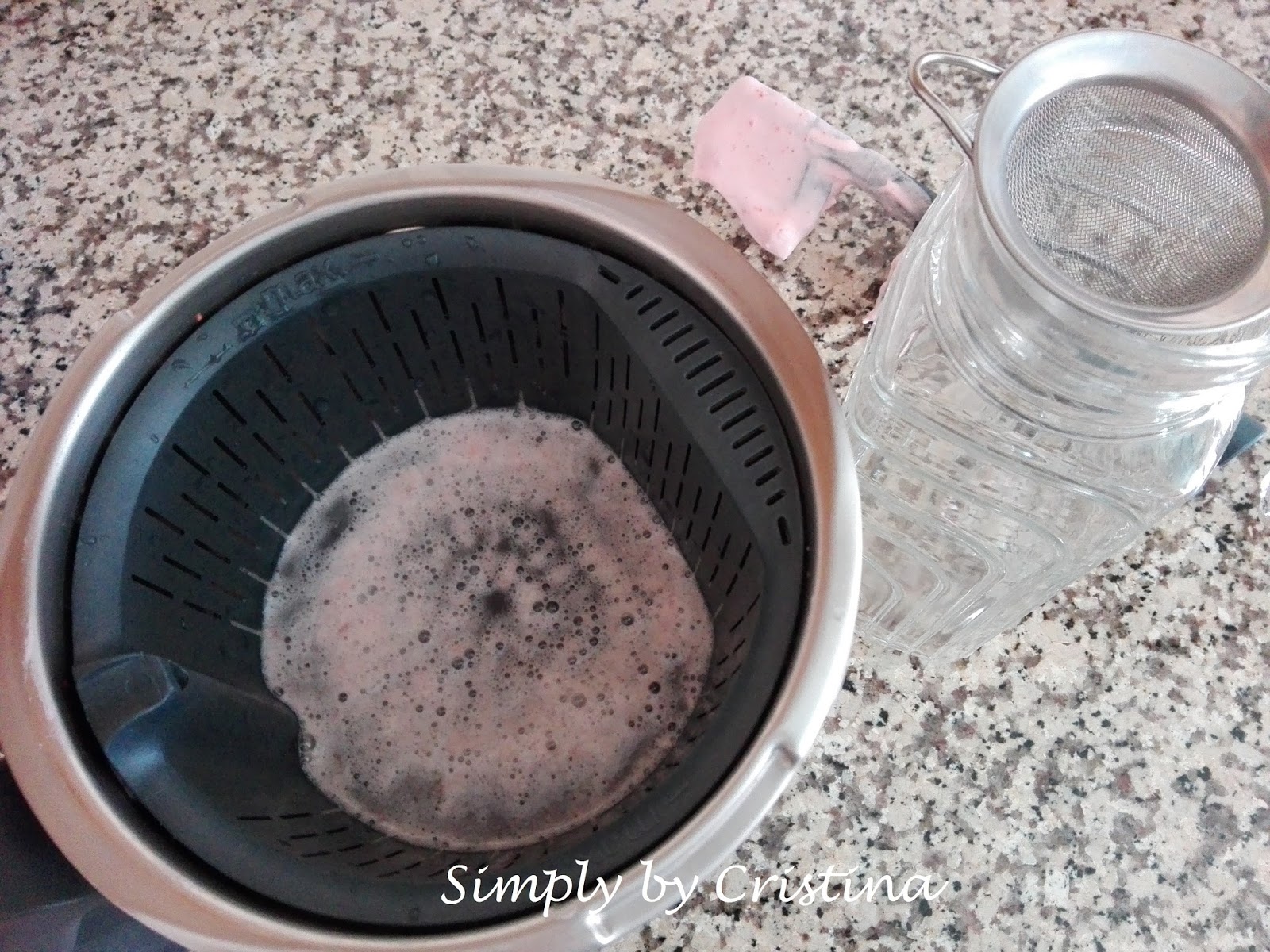 7. Retirar o copo da base da Bimby e inserir o cesto para coar. Na jarra, onde deito a Limonada, coloco ainda um coador para que fique apenas e SÓ o liquido.