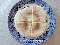 5. Dividir a massa em bolas que se achatam de modo a formar uma bolacha com a espessura de 1cm e um palmo de diâmetro. 6. Como não tenho pedra de basalto, cozi numa frigideira anti-aderente a qual deverá estar quente. Deixar cozer até ganhar uma crosta fina, mas ligeiramente tostada. Virar e deixar cozer do outro lado.
