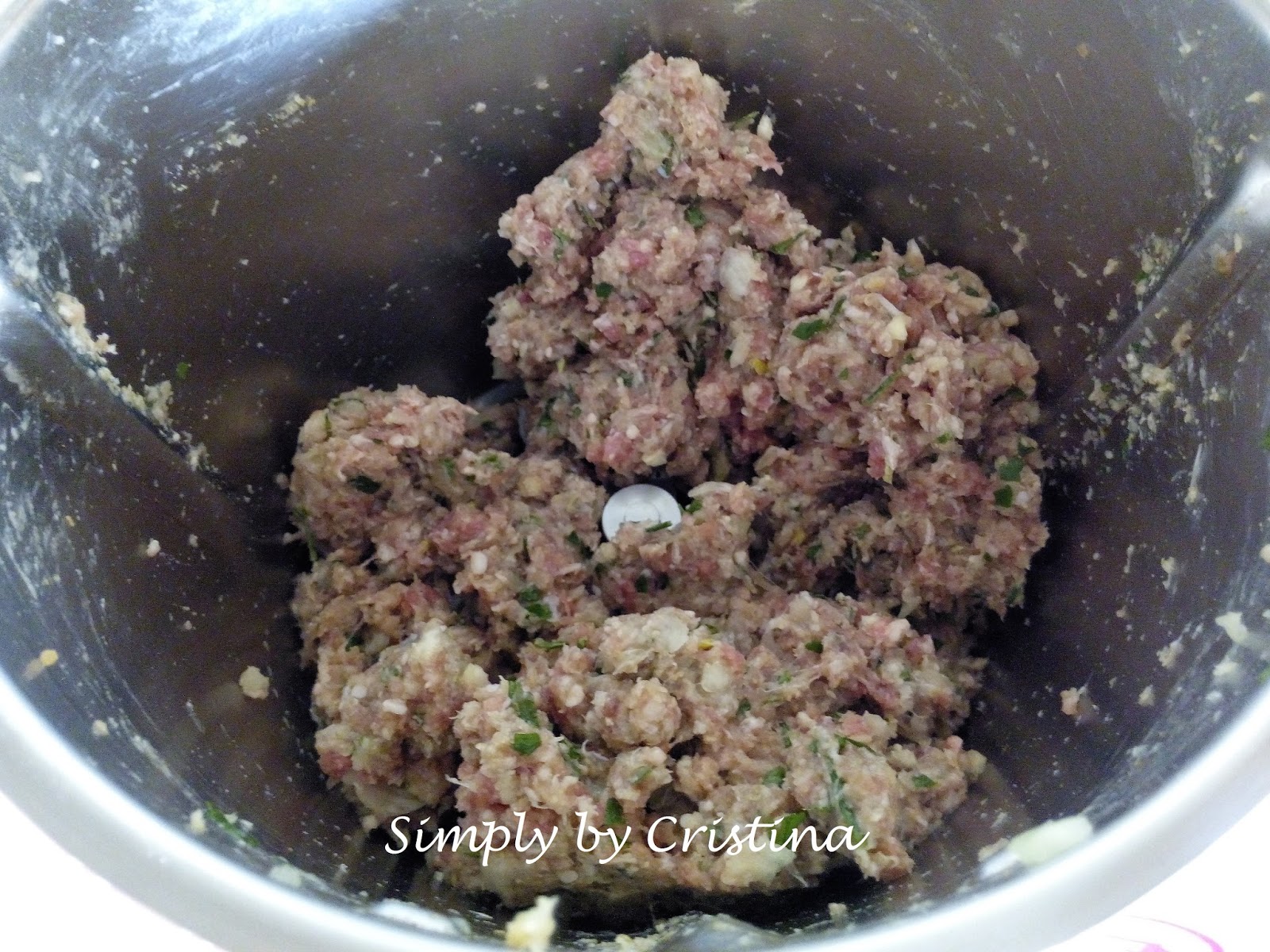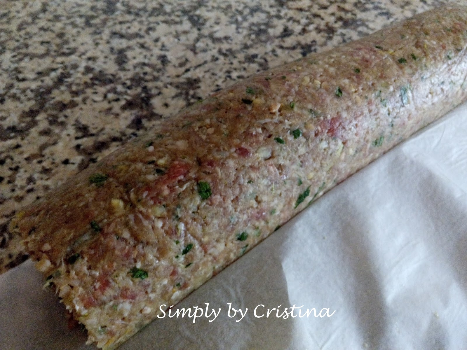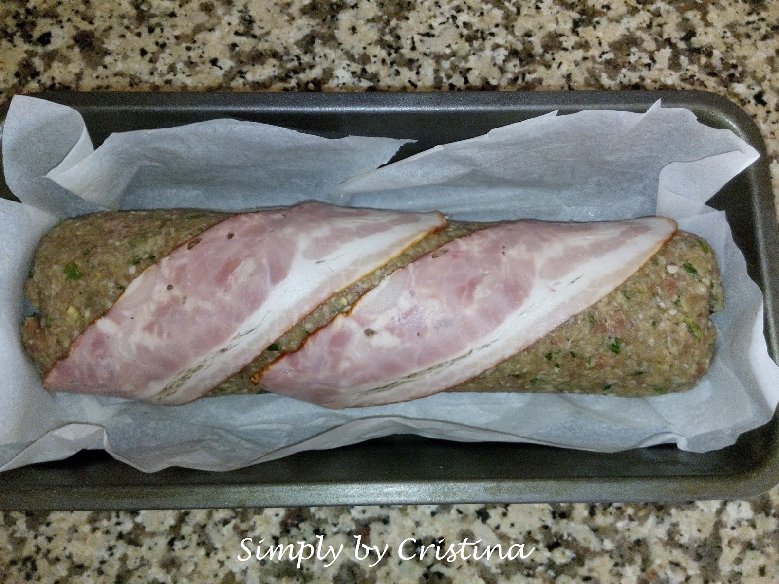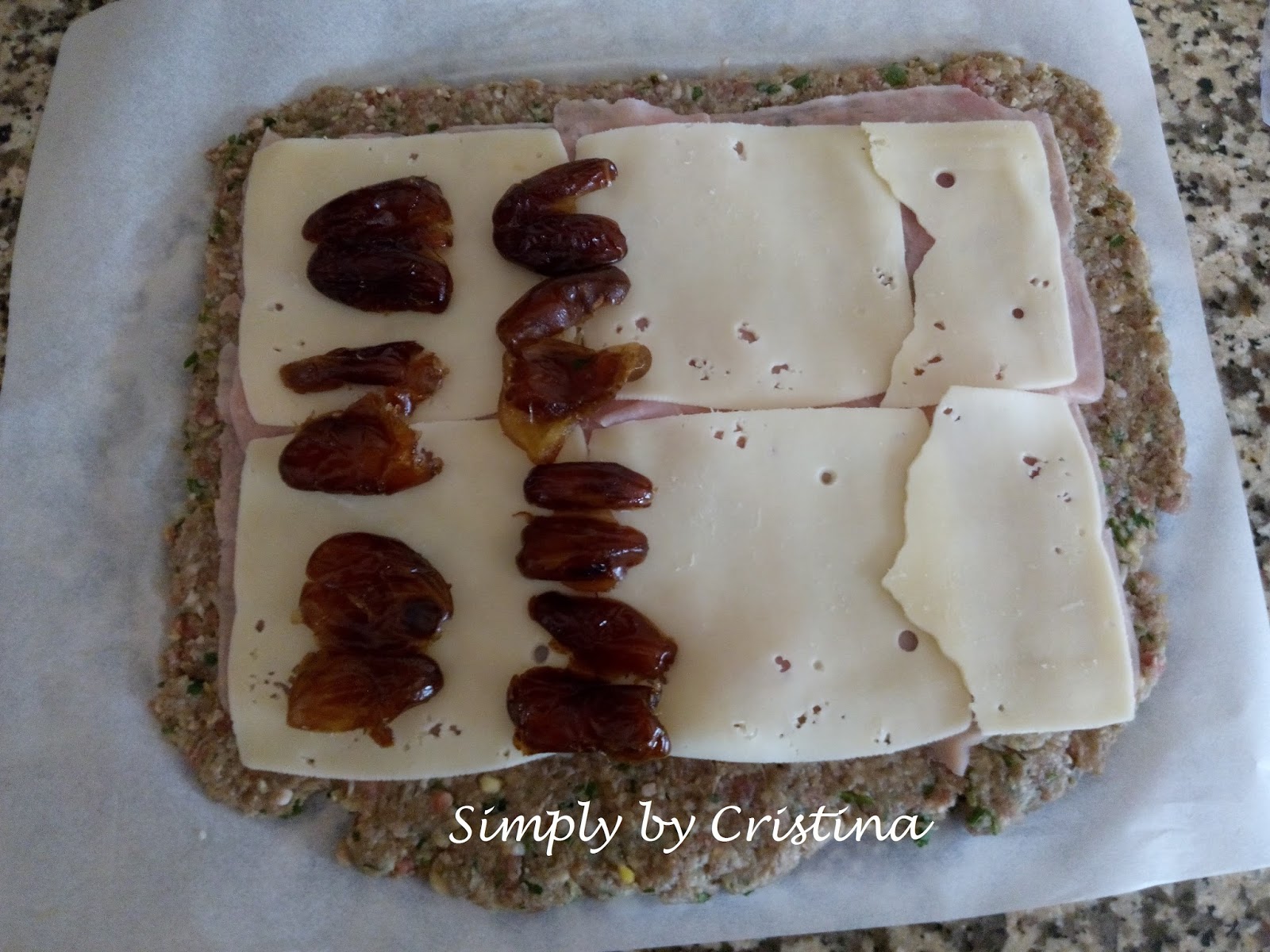 Ingredientes: 200g pão ralado aromatizado, feito na Bimby ;) 1 cebola grande Alho em pó Suldouro Navires Ervas Aromáticas Aroma Alentejo a gosto 1Kg de carne de vitela picada 2 ovos Sal Salinas Corredor do Sol Noz-Moscada Fatias de Bacon, Fiambre e Queijo Tâmaras Preparação: 1. Fazer pão ralado aromatizado, receita, AQUI Reservar. 2. No copo colocar a cebola, o alho, as ervas aromáticas, sal e noz-moscada. Programar 10Seg./Vel.5 3. Adicionar a carne picada, 1 ovo e 100g do pão ralado. 10Seg./Vel.4