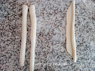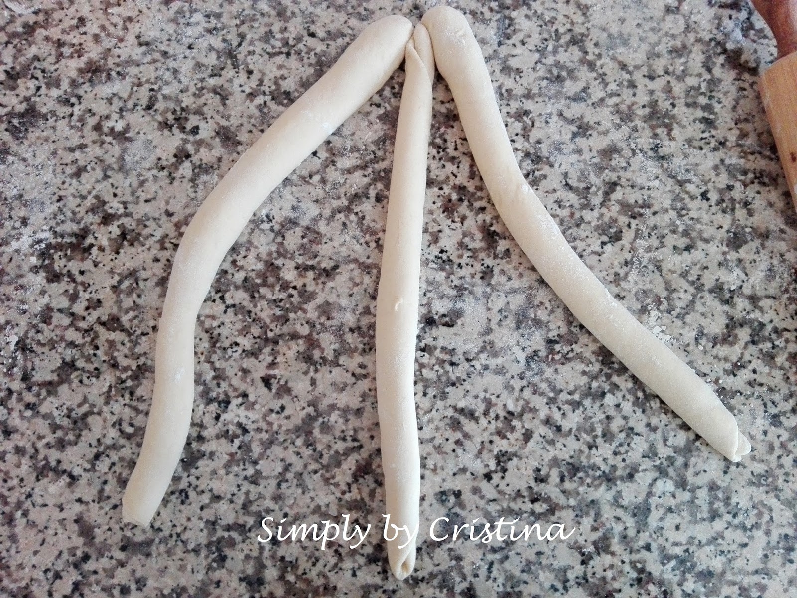 4. Depois de levedada, polvilhar a superfície onde vão trabalhar a massa com farinha. Podem usar toda a massa para UMA Trança e assim vão obter uma trança GIGANTE. Eu prefiro dividir a massa em 2 partes iguais e depois cada uma delas em 3. 5. Depois de dividida a massa e com a ajuda de um rolo da massa, esticar cada uma das partes. Enrolar de modo a obter 3 rolos de tamanho igual, colocando as dobras para baixo.