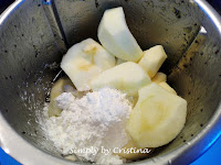 2. Inserir no copo todos os ingredientes. Programar 20Seg./Vel.4 O uso da Vel.4 vai fazer com que a maçã não fique totalmente desfeita, mas sim em pequenos pedacinhos. Estes pedacinhos durante a cozedura, vão ficar à superfície da Tarte. Quem desejar desfazer mesmo a maçã, deve selecionar a Vel.7