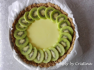 8. De seguida, já com o pudim solidificado, decorar a tarte com os Kiwis a gosto.