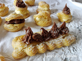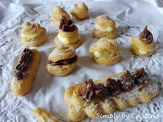 De regresso a casa, trouxe uns exemplares...para mais tarde DEVORAR! Andei uns dias a pensar em fazer...agendava, delineava, mas acabava por adiar. Até que, ontem, foi o dia de pôr em prática a minha primeira experiência neste mundo dos Éclairs, Profiteroles e Afins (todos aqueles que não saíram perfeitos)...