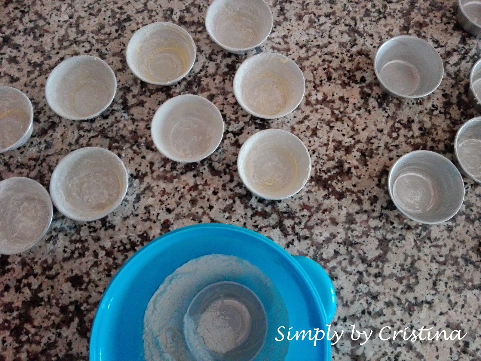 1. Untar formas de alumínio, usei as dos pastéis de nata com manteiga e polvilhei com farinha. Reservar.