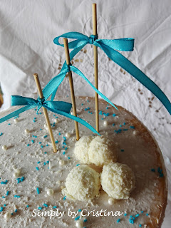 Cobertura de Mascarpone: 2c. sopa de Açúcar (podem adicionar mais açúcar) 200ml Natas frescas (bem frias) 150g Queijo Mascarpone Para decorar: Bombons Rafaello Pérolas, Pepitas azuis VAHINÉ Coco ralado