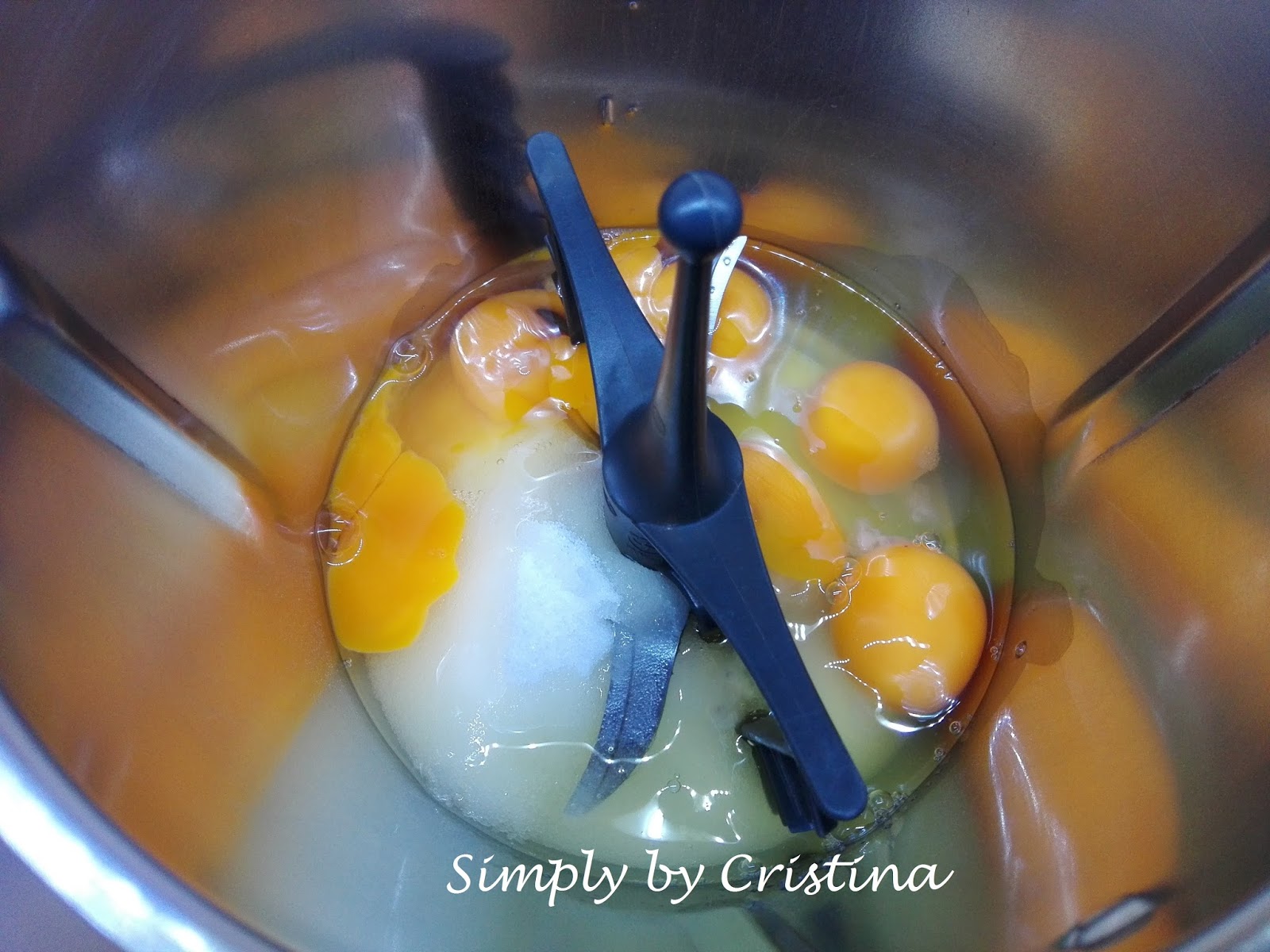 4. Com a ajuda de uma batedeira, bater as claras em castelo. Reservar. 5. Ao preparado das gemas adicionar o óleo. Envolver 30Seg./Vel.3 6. Retirar a borboleta. Adicionar a farinha e o fermento. Programar 15Seg./Vel. 3