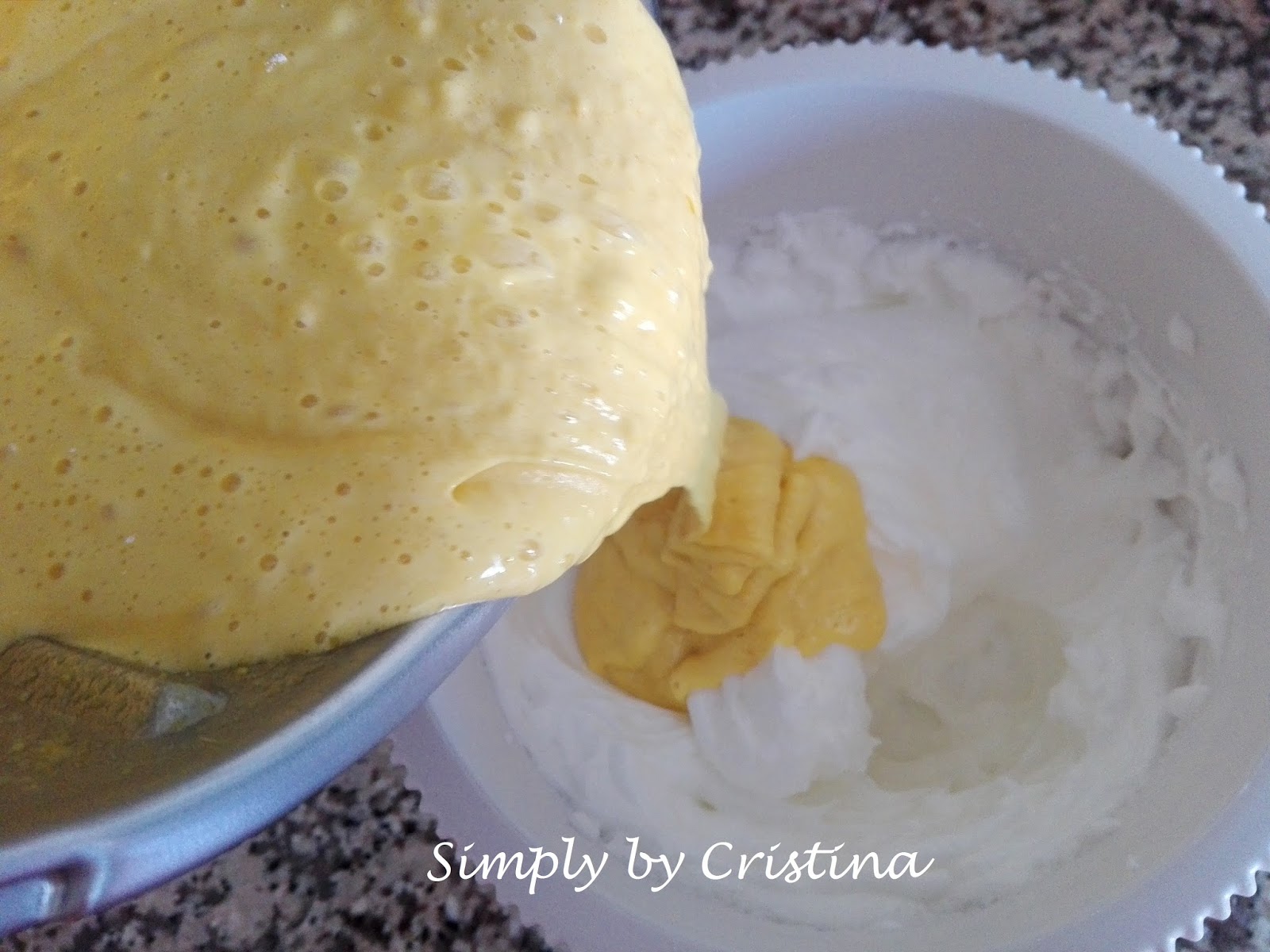 7. Verter este preparado no recipiente das claras em castelo e envolver delicadamente.