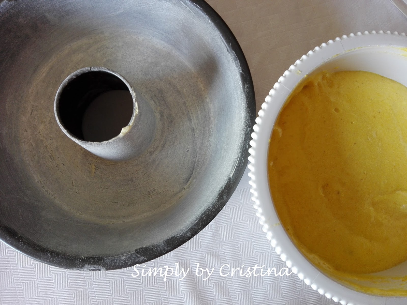 8. Pré-aquecer o forno a 180º 9. Untar uma forma de chaminé com manteiga e polvilhar com farinha.