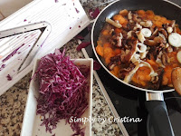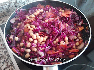 Com o azeite já quente deitar os legumes em camadas, o grão de bico e os cogumelos Shiitake.