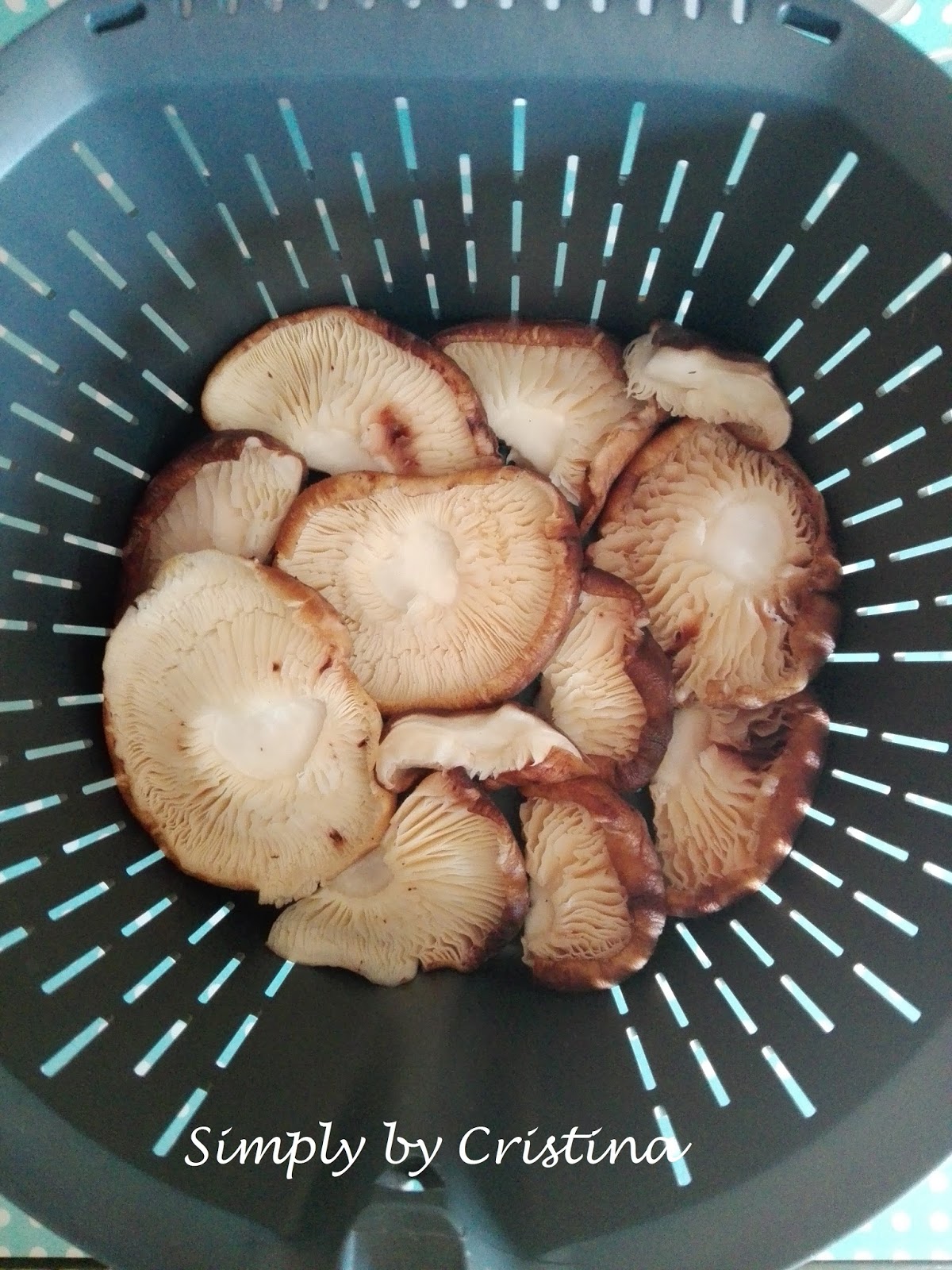 1. Preparar os Shiitake: lavar em água corrente e remover o caule do cogumelo.